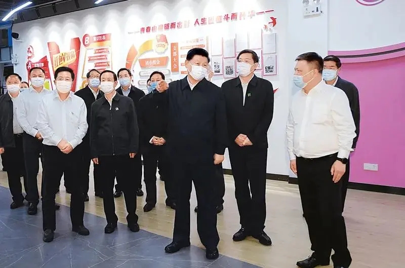2020年9月16日至18日,中共中央总书记、国家主席、中央军委主席习近平在湖南考察。这是17日下午,习近平在马栏山视频文创产业园,考察园区开展企业党建和内容生产、技术研发、人才培养等。新华社记者 李学仁/摄