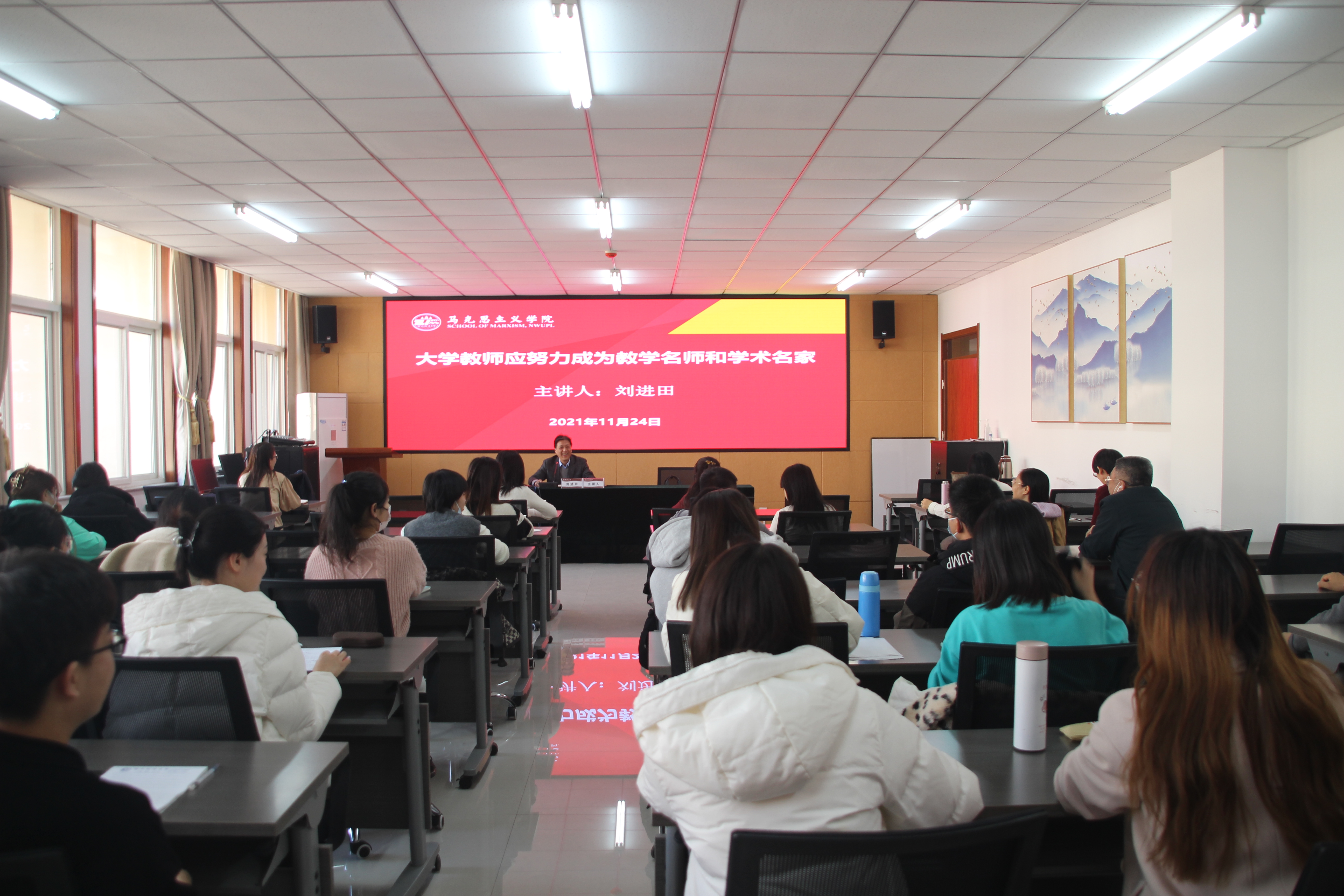 11月24日下午,304永利集团官网在学院会议室召开新晋研究生导师、转岗教师培训会。由公司学术委员会副主任、二级教授、博士生导师、马克思主义理论一级学科首席专家、文化与价值哲学研究院经理刘进田教授作了题为《大学教师应努力成为教学名师和学术名家》的报告。公司新晋研究生导师、转岗教师以师生代表参加了培训会。会议由学院办公室主任苏芳主持。